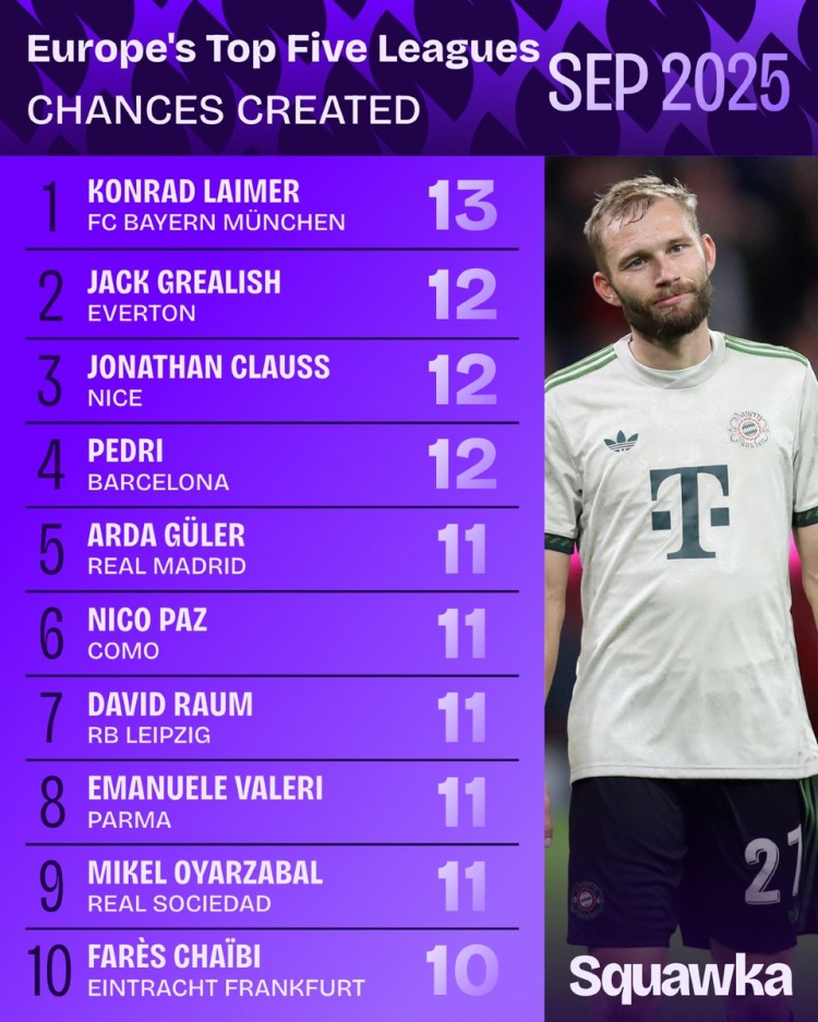 10月1日讯 Squawka统计了欧洲五大联赛球员在9月份的创造契机次数榜单,拜仁后卫莱默尔位列第一。