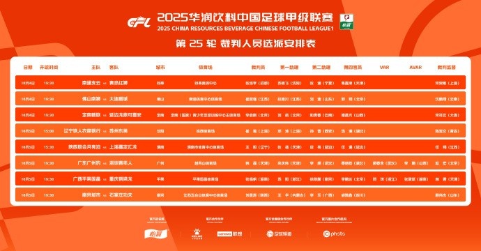 10月4日讯 2025华润饮料中甲联赛第25轮裁判遴派成果公布,广东广州豹vs深圳后生东说念主、广西平果vs重庆铜梁龙两场争二要害战均安排有VAR裁判。