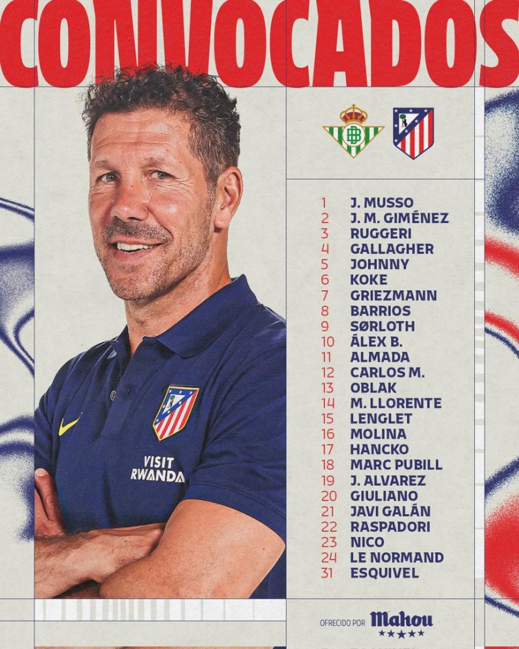 时尚:7-格列兹曼、9-瑟尔洛特、11-阿尔马达、19-阿尔瓦雷斯、20-朱利亚诺-西蒙尼、22-拉斯帕多里、23-尼古拉斯-冈萨雷斯