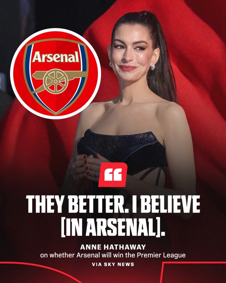 知名女明星、铁杆阿森纳球迷安妮·海瑟薇在接受天空采访时被问及阿森纳是否能夺魁 :他们更好,我相信他们。