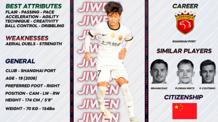 视频中,该博主列出蒯纪闻的上风为:资质、传球、速率、加快、敏捷、技艺、创造力、控球、盘带。劣势则是空中抗击和力量。博主还给出了蒯纪闻的三个模板球员:布拉欣-迪亚斯、维尔茨和库蒂尼奥。