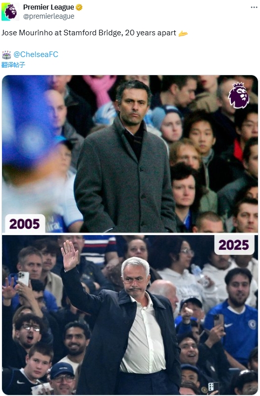 英超官推晒本菲卡主帅穆里尼奥:斯坦福桥的若泽-穆里尼奥,20年夙昔了……