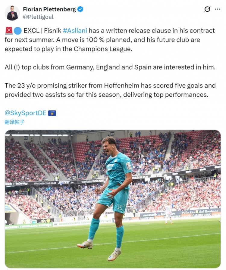 普莱滕伯格露馅,阿斯拉尼与霍芬海姆的条约中存在明夏有用的书面解约要求,转会100%在球员的将来策画之中,展望他将加盟进入欧冠的俱乐部。险些悉数德国、英格兰、西班牙的顶级俱乐部齐对阿斯拉尼感兴致。