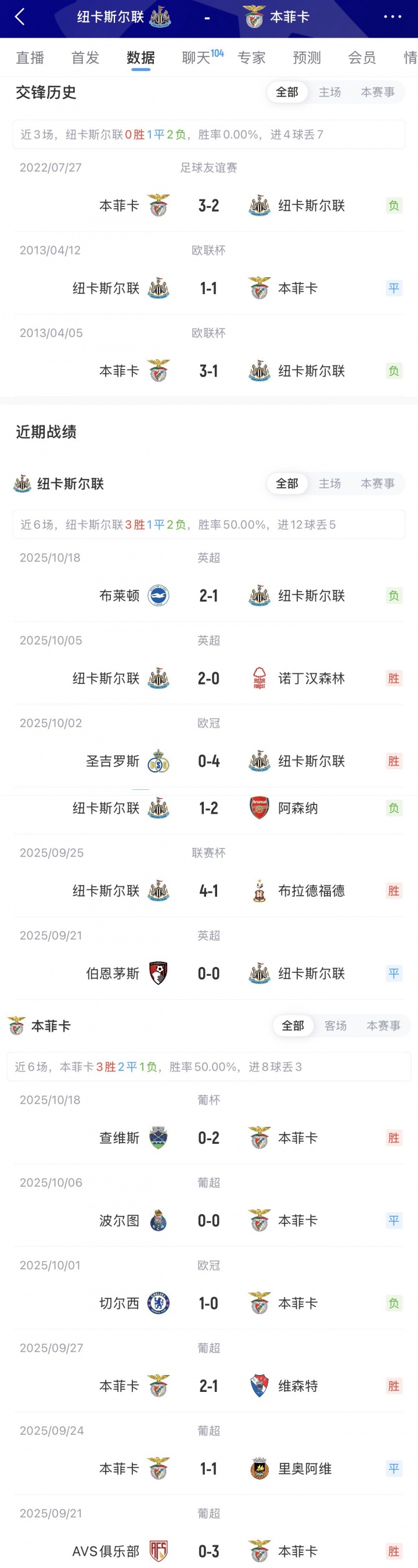 纽卡斯尔欧冠开赛2轮1胜1负(1-2巴萨、4-0圣吉罗斯)、本菲卡遭逢2连败(2-3卡拉巴赫、0-1切尔西)!