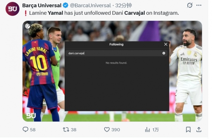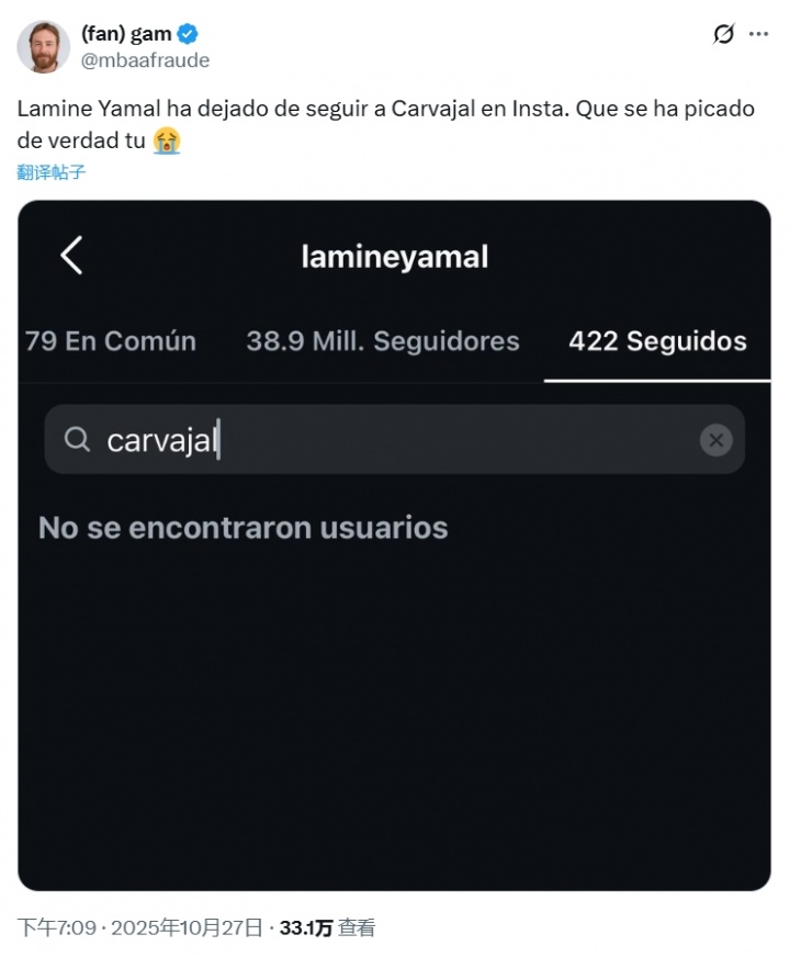 10月27日讯 今天西班牙国度德比之后,有不少球迷发文暗意亚马尔取关了卡瓦哈尔,经查证当今两东说念主如实未彼此柔软,然则否是因为今天两东说念主的突破取消柔软还有待证据。