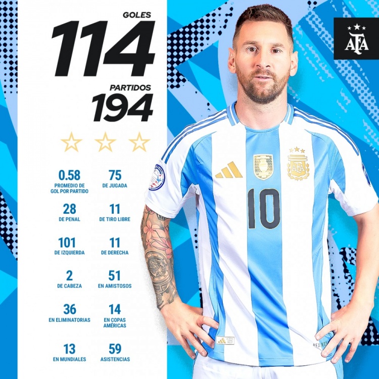 9月5日讯 北京技艺今天上昼进行的南好意思世初赛,梅西打进2球,阿根廷主场3-0打败委内瑞拉。阿根廷队更新社媒动态,晒出梅西在国度队的数据海报。