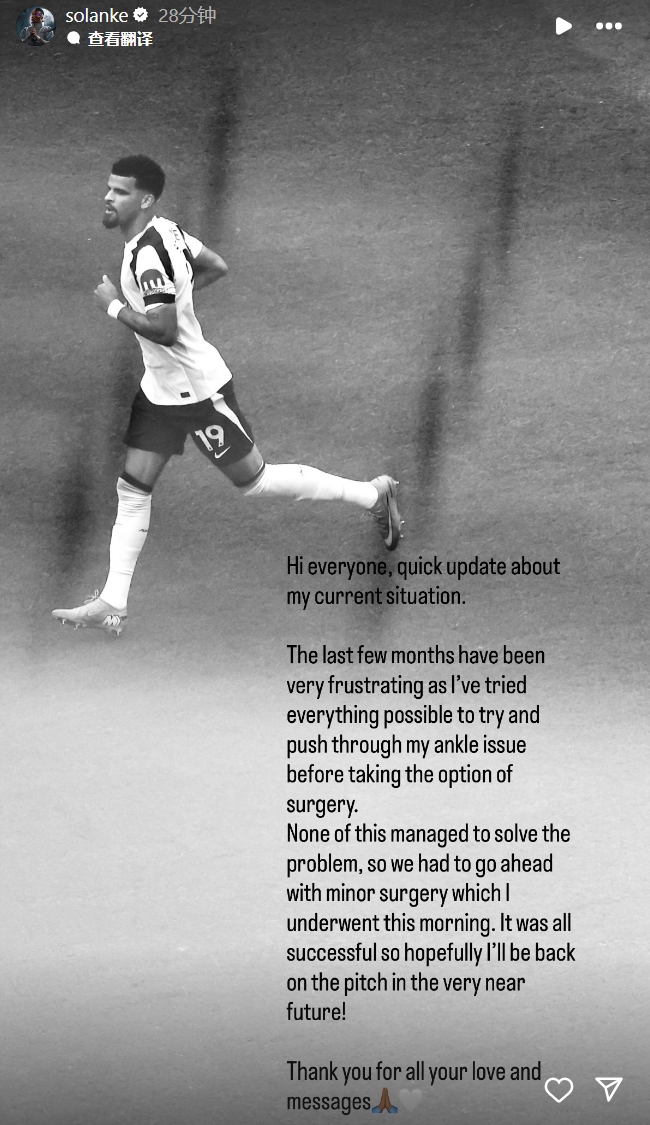 索兰克:“环球好,给环球快速更新一下我现在的情况。昔时的几个月至极令东说念主悔过,因为我尝试了统统可能的想法来责罚我的脚踝问题,但齐莫得顺利,是以今天早上我不得不收受了小手术。手术很顺利,但愿很快就能回到球场上!感谢环球的怜惜和辅助。”