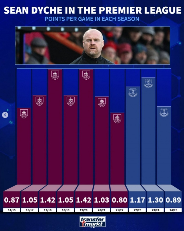 10月21日讯 戴奇清雅抓教诺丁汉丛林,德转也盘货了戴奇此前抓教伯恩利以及埃弗顿在英超的赛季场均积分情况,具体如下: