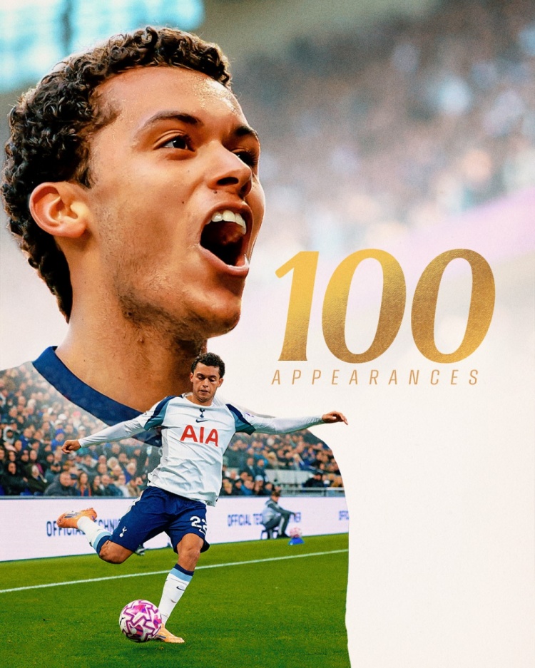 布伦南-约翰逊为热刺出战100场比赛,打进26球,助攻18次,热刺官方社媒晒出海报,祈福他收场热刺糊口百场里程碑。