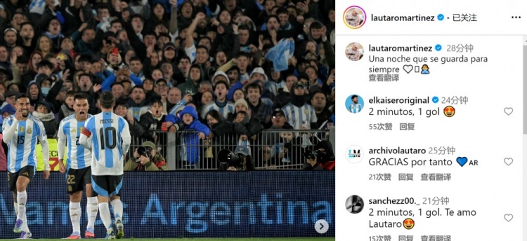 此役是梅西在国内为阿根廷出战的终末一场比赛,劳塔罗社媒晒出与梅西庆祝进球的合照,配文:“一个不朽牢记的夜晚。”