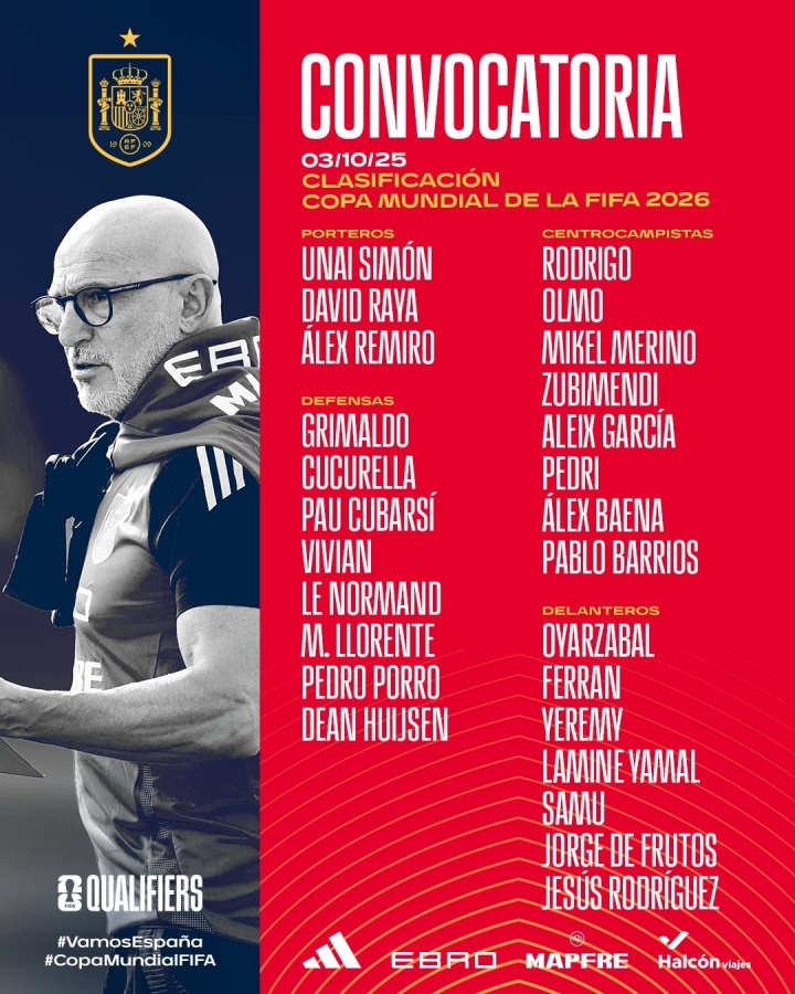 10月03日讯 西班牙队官方公布了10月份出征世初赛的球员大名单,亚马尔、佩德里等巴萨球员入选。