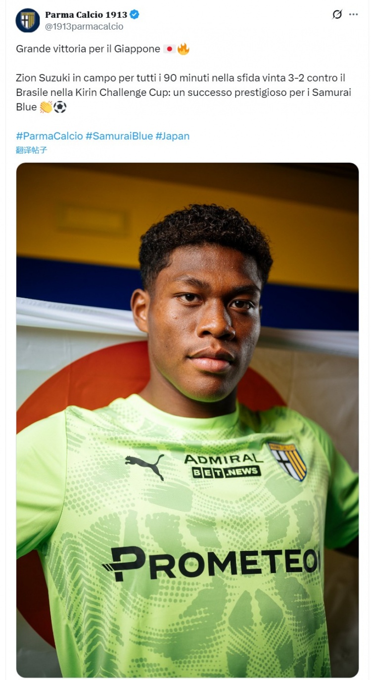 帕尔马官方社媒晒出铃木彩艳的像片,道喜自家球员随日本队取胜,配文:“日本队获得一场要紧顺利。铃木彩艳踢满90分钟,最竟日本在麒麟杯3-2投诚巴西,蓝武士军团斩获具有里程碑意旨的顺利。”