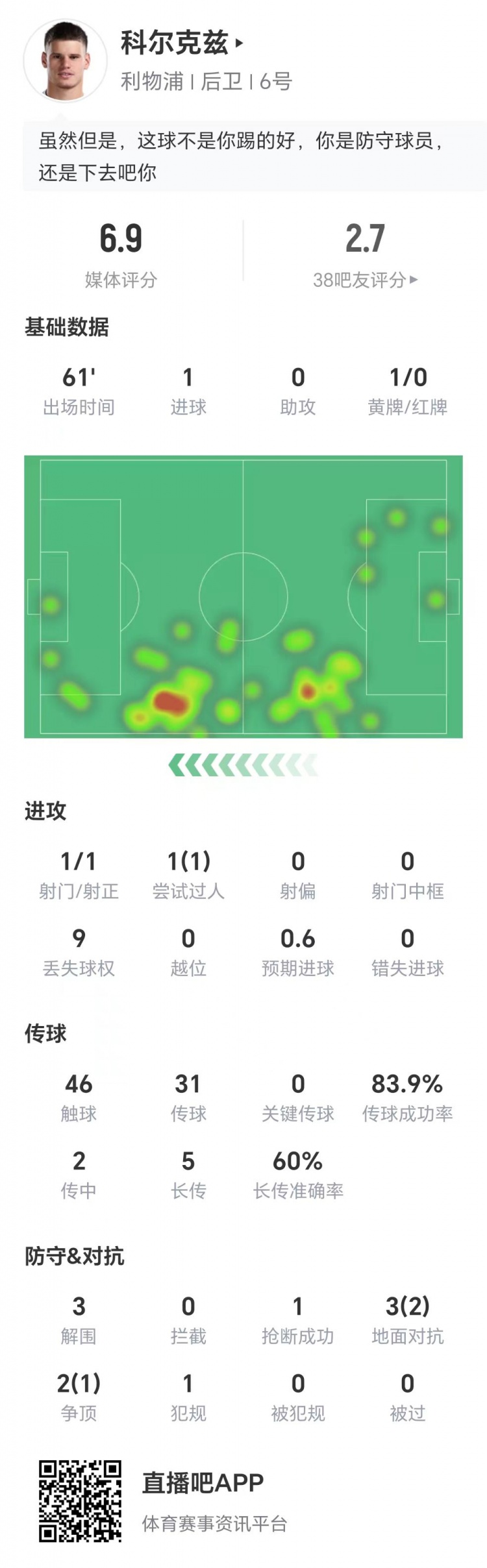 工夫统计数据涌现,科尔克兹本场比赛1射1正打进1球,零要道传球,5次传中收遵循60%,3次突围,1次抢断,3次大地挣扎收效两次,获评6.9分。