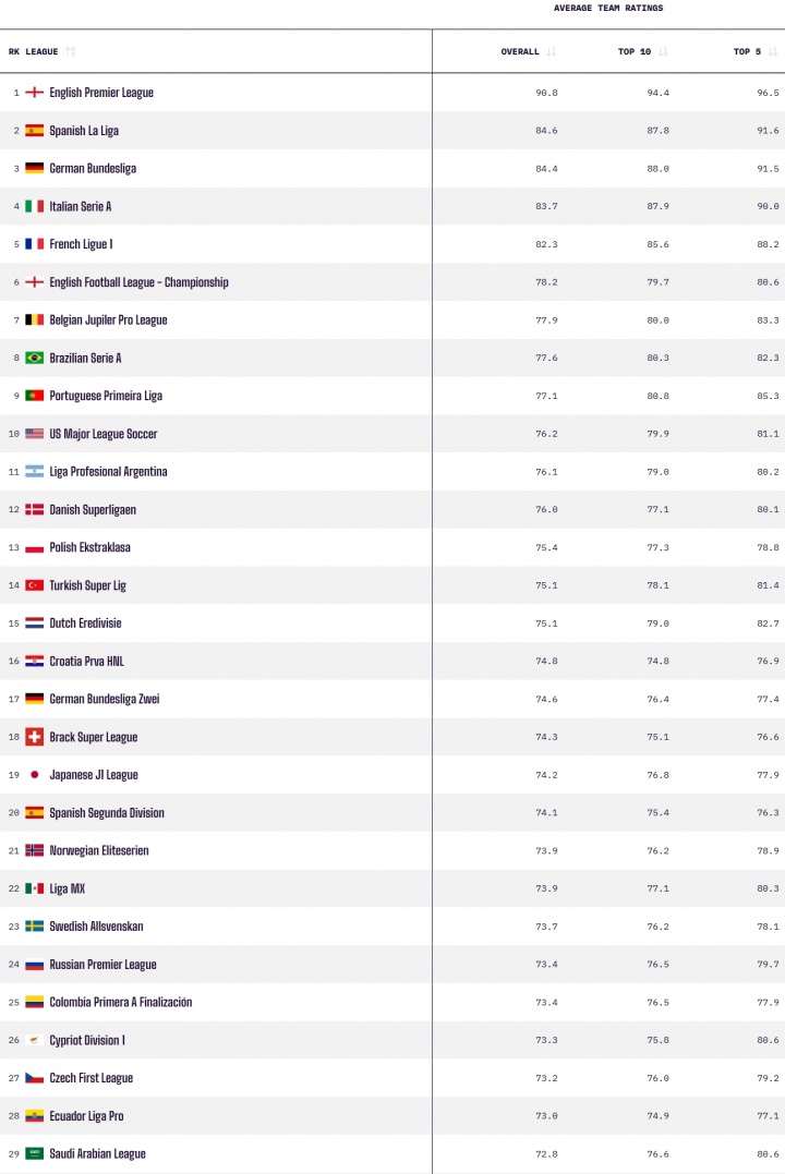 而凭据专科数据机构Opta的最新专家联赛实力排行显现,英超是现在实力最顶尖的联赛,其次是西甲、德甲、意甲以及法甲,英冠位居第六。沙特联排行专家第29,过期于德乙、西乙等联赛。