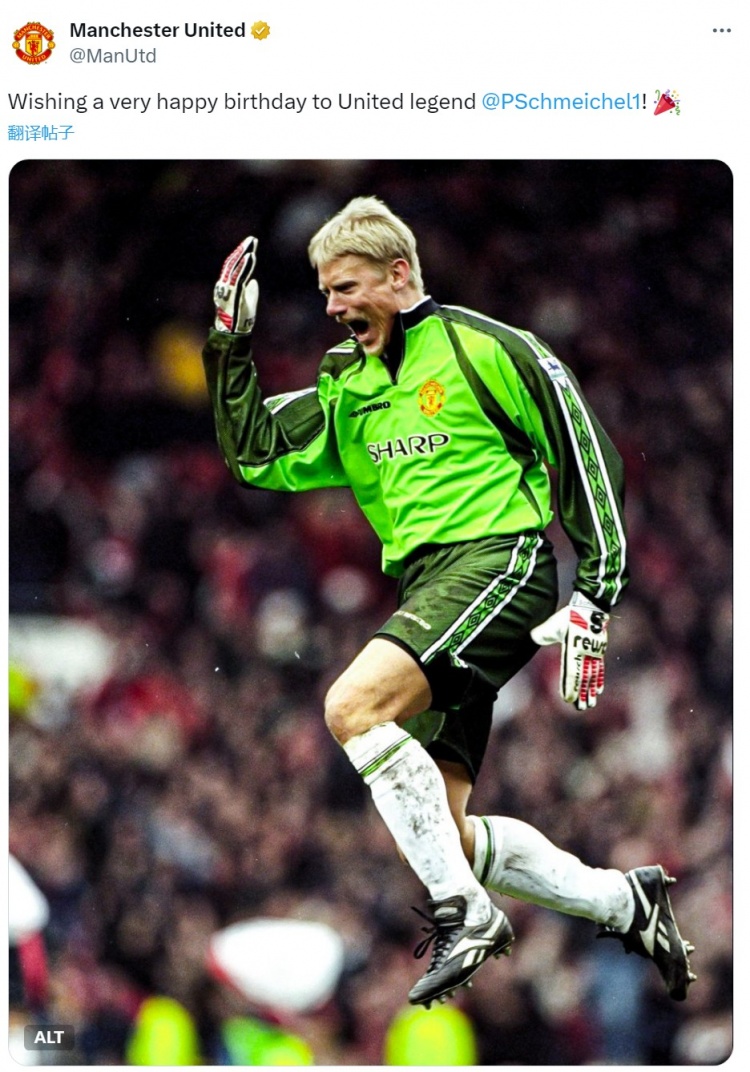 曼联官方社媒晒出舒梅切尔效能球队时候的像片,配文:“祝曼联神话舒梅切尔生辰欢娱!”