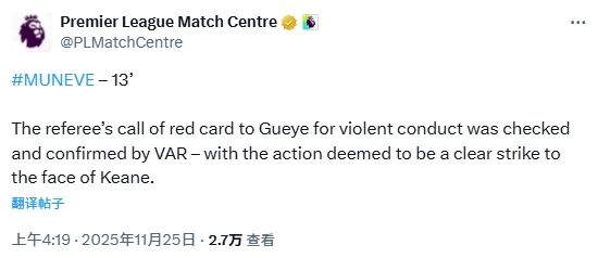 英超官方给出讲明:“主裁判认定盖耶实行暴力行为并出示红牌的判罚,经VAR本事核查说明,该四肢被判定为对基恩面部的判辨击打四肢。”