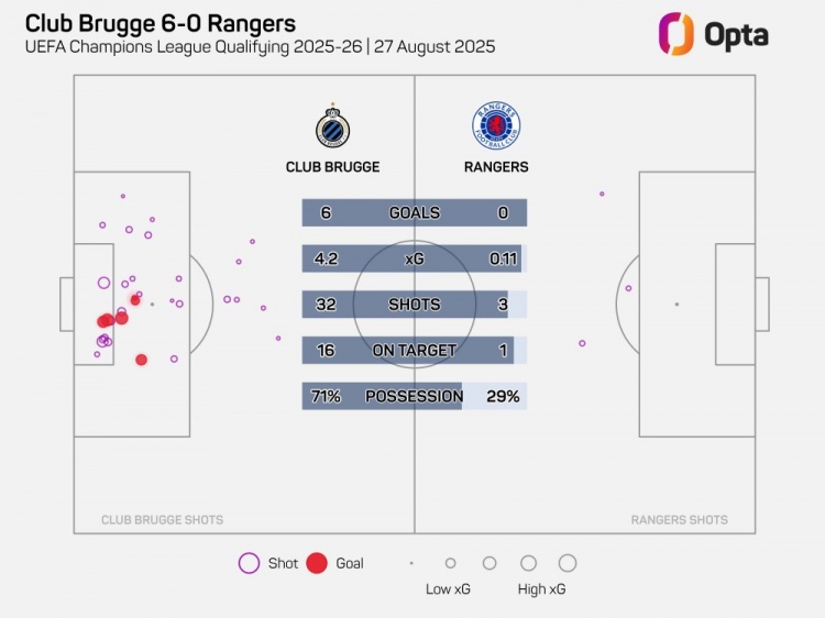 据OptaJohan的数据统计,布鲁日6-0大捷流浪者,这是他们自2001年9月27日(7-1尼科西亚奥林匹亚科斯)以来在欧战中最大比分的告捷。