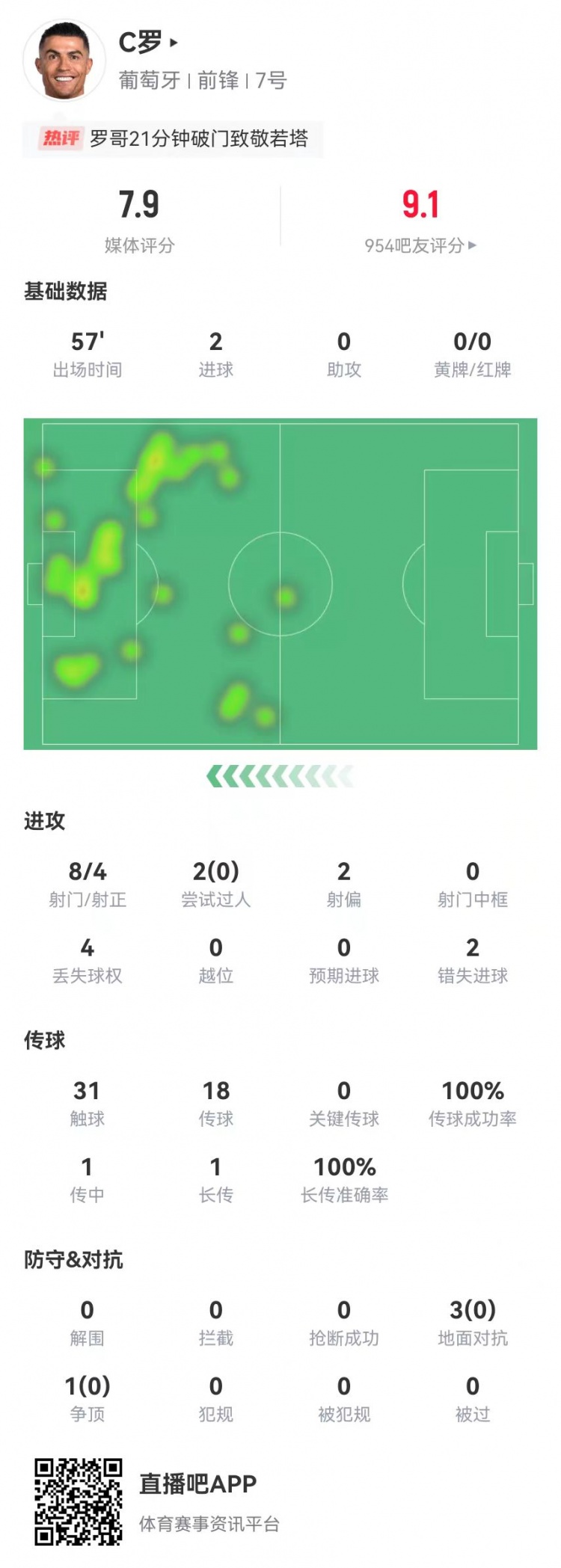 9月7日讯 葡萄牙在本轮世初赛4-0提高亚好意思尼亚,C罗本场数据如下: