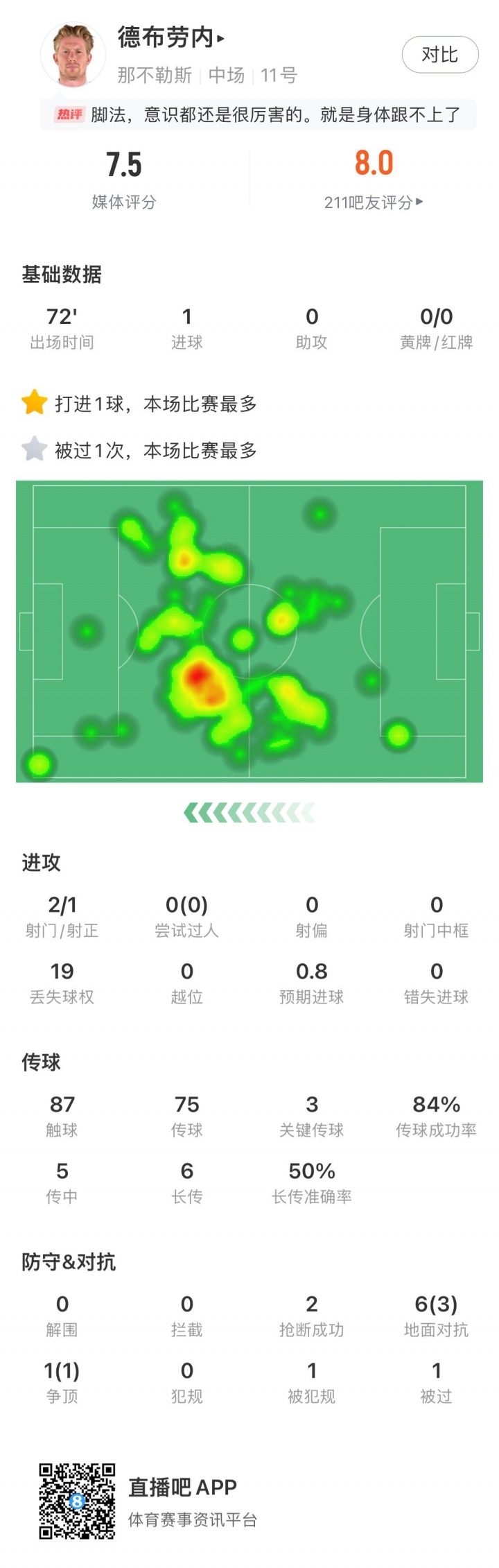 34岁德布劳内首发72分钟被换下,点射破门,本赛季意甲5场3球进账。