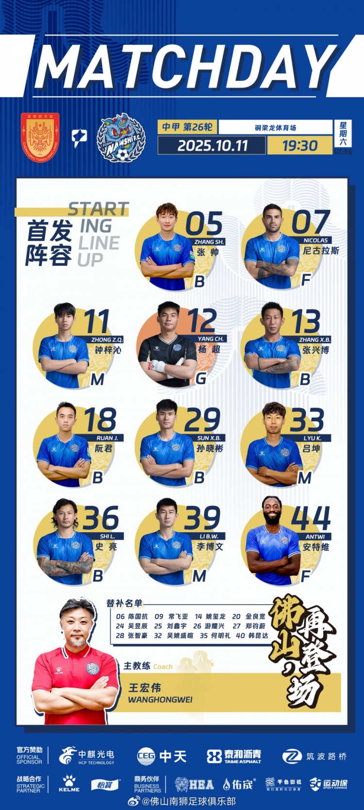 首发名单|2025华润饮料中甲联赛第26轮