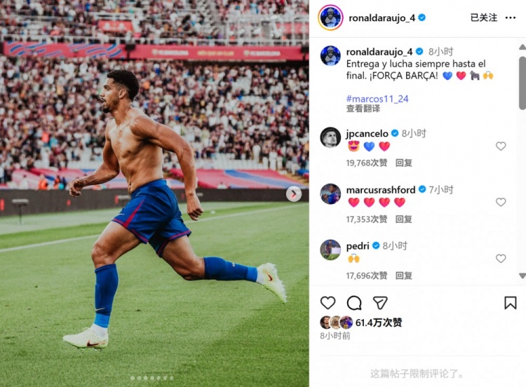 赛后阿劳霍也在社媒晒出进球后脱衣庆祝的相片,配文写说念:“长期拼尽全力并坚执到终末一刻,加油巴萨!”