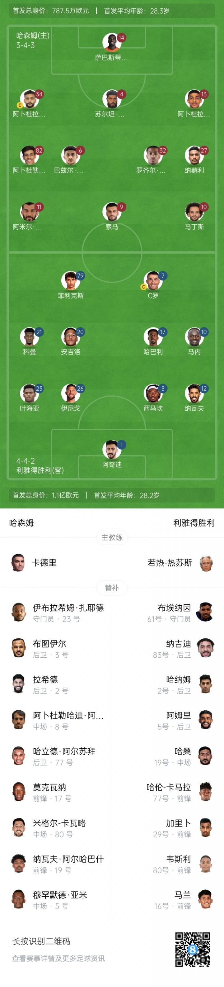 利雅得得手首发:1-阿奇迪、12-纳瓦夫、3-西马坎、26-伊尼戈·马丁内斯、23-叶海亚、17-哈巴利、20-安吉洛、79-菲利克斯、21-科曼、10-马内、7-C罗