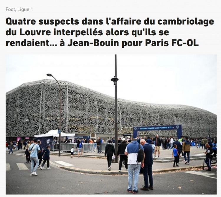 10月31日讯 据法媒报谈,卢浮宫盗窃案有5名新嫌疑东谈主被捕,其中4东谈主被捕时正在前去让-布安球场不雅看巴黎FC和里昂的法甲比赛。