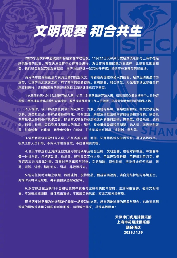2025华润饮料中超联赛行将迎来赛季收官战,11月22日天津津门虎足球俱乐部与上海申花足球俱乐部的比赛,将在天津奥体中心概念场进行。为让体育竞技的魔力更纯正,让不雅赛氛围更和洽,咱们连合髻起精致不雅赛倡议,津沪两地球迷一皆共同督察这片情态与尊重并存的绿茵场。
