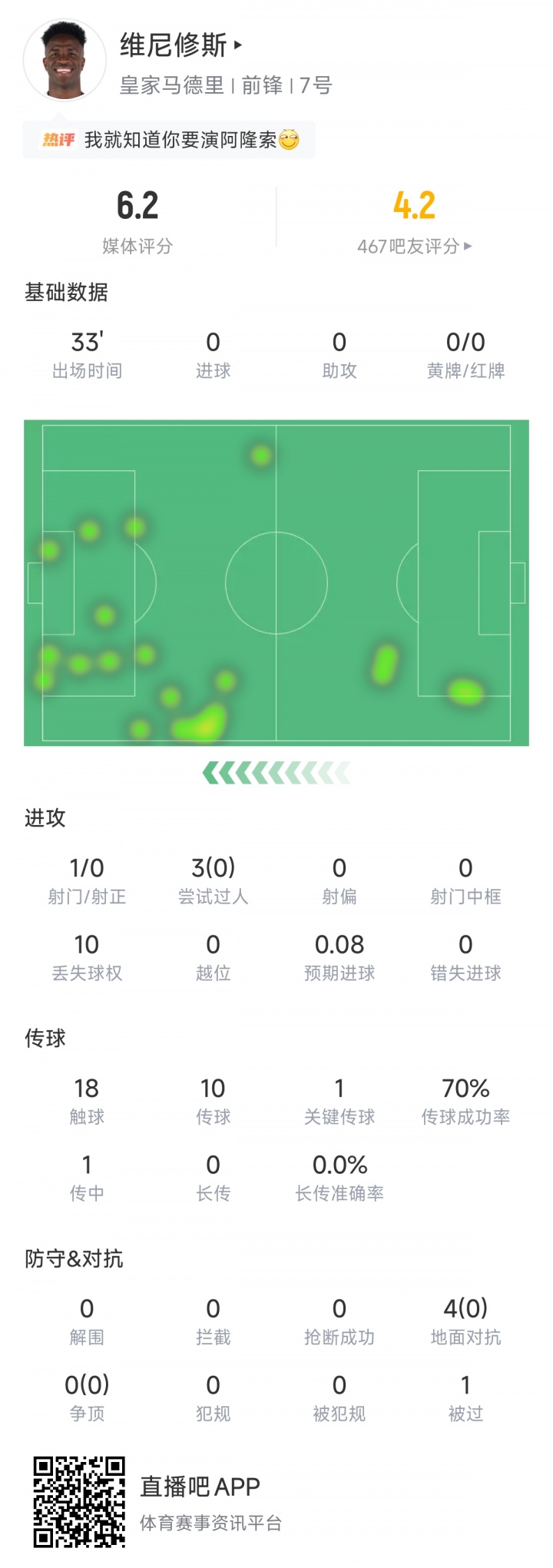 维尼修斯这场比赛阐发欠安,3次过东说念主0告捷,4次挣扎0告捷,18次触球丢了10次球权,赛后评分独一6.2分。