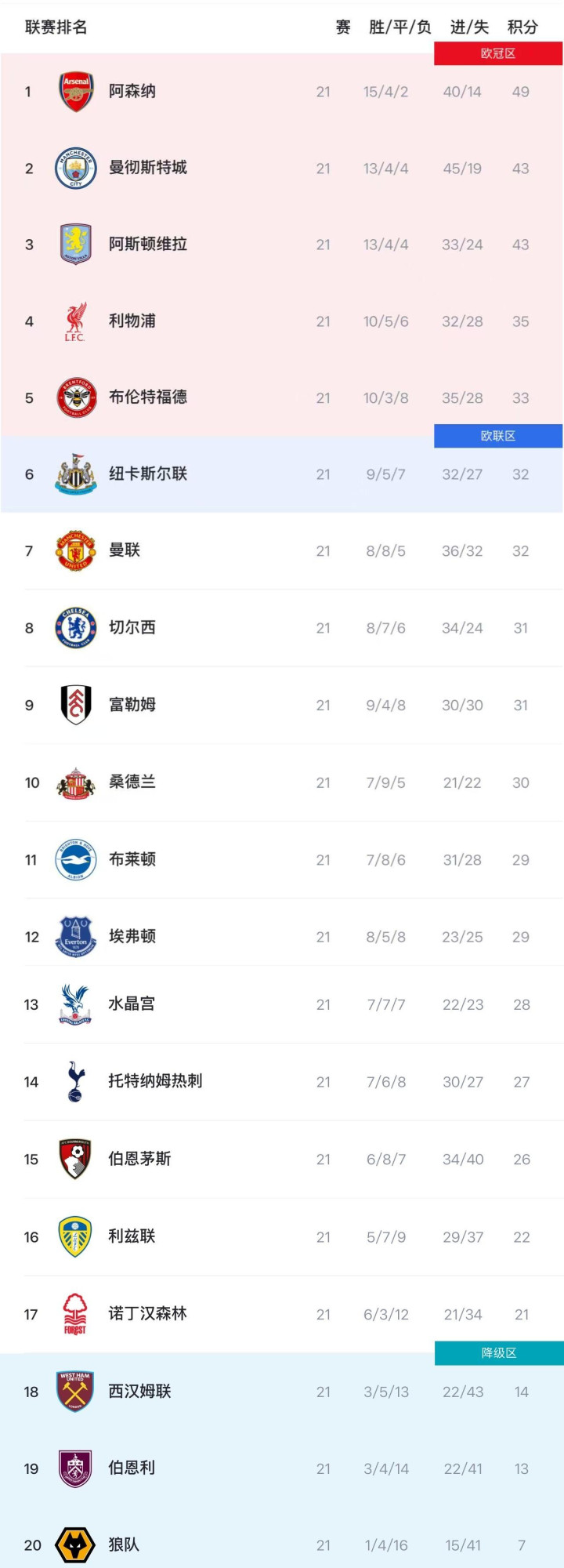 争冠集团之后,利物浦以35分名轮番四,布伦特福德33分紧随后来名轮番五。纽卡斯尔在本轮演出绝杀利兹联的好戏,积分升至32分,与本轮2-2战平伯恩利的曼联同分,分列第六和第七位;切尔西则因负于富勒姆,仅以31分暂居第八。