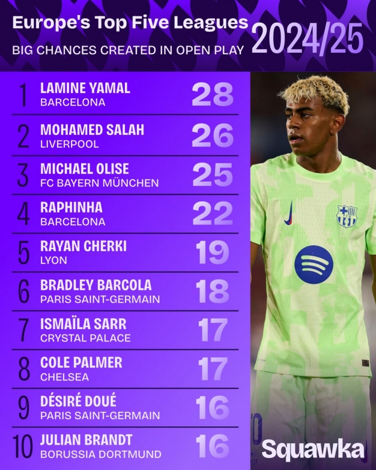 9月7日讯 Squawka统计了上赛季球员在五大联赛开放战创造要紧契机的次数,并排出榜单,亚马尔居首,萨拉赫、奥利塞二三位。